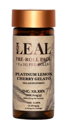 LEAL Pre-Roll Multipacks contain 5 Pre-Rolls, each made with 1 gram of 100% Flower; packaged in a child-resistant, screw-top jar.