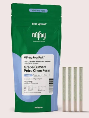 Grape Guava x Petro Chem by MFNY is a resin-infused pre-roll pack that delivers a fusion of fruity and fuel-forward enjoyment.