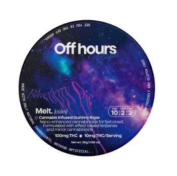 Experience deep relaxation with Off hours Blueberry Pie Melt ropes. Specially formulated with THC, CBD, and CBN to help you melt.