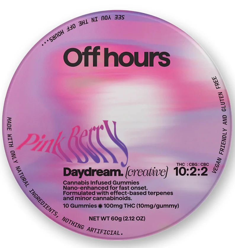 Off hours Pink Berry gummies are specially formulated with the perfect combination of THC, CBG, and CBC to give you that creative, uplifting feel that makes it easier to get into a good mood or a fun flow. Nano-enhanced cannabinoids for fast onset. Vegan friendly and gluten free.