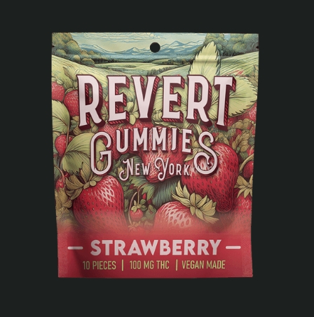 Revert Strawberry 100mg Gummy Pack Revert THC Gummies are crafted for consistency, convenience, and a clean edible experience. Each package contains 10 easily separable 10mg portions (100mg total) for simple, precise dosing. Made with cannabis distillate and a pectin-based (gelatin-free) formula, these gummies offer a smooth, reliable effect and a soft, chewy texture, and are vegan-made. Strawberry features a sweet, fruit-forward flavor with a smooth, candy-like finish.