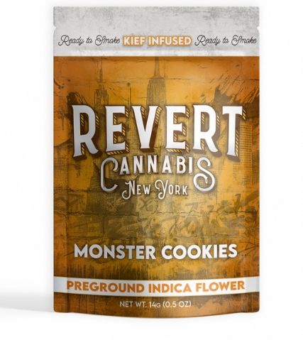 Monster Cookies – 14g kief infused ground flower crafted from sungrown indica flower, bred from Girl Scout Cookies × Granddaddy Purple, highlighting sweet vanilla and light herbal tones with a terpene-rich aroma of earth and soft spice. Its character feels rich yet composed.